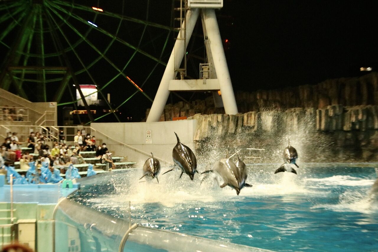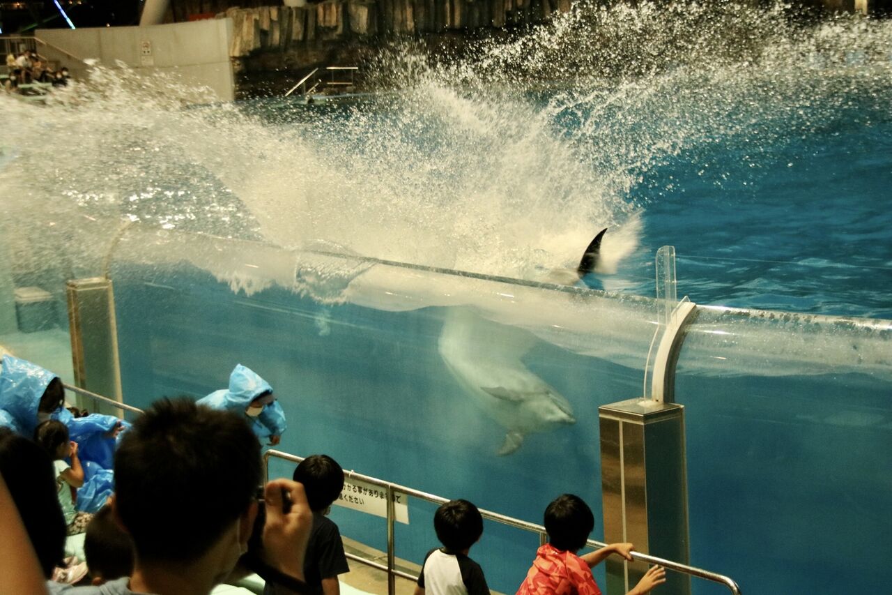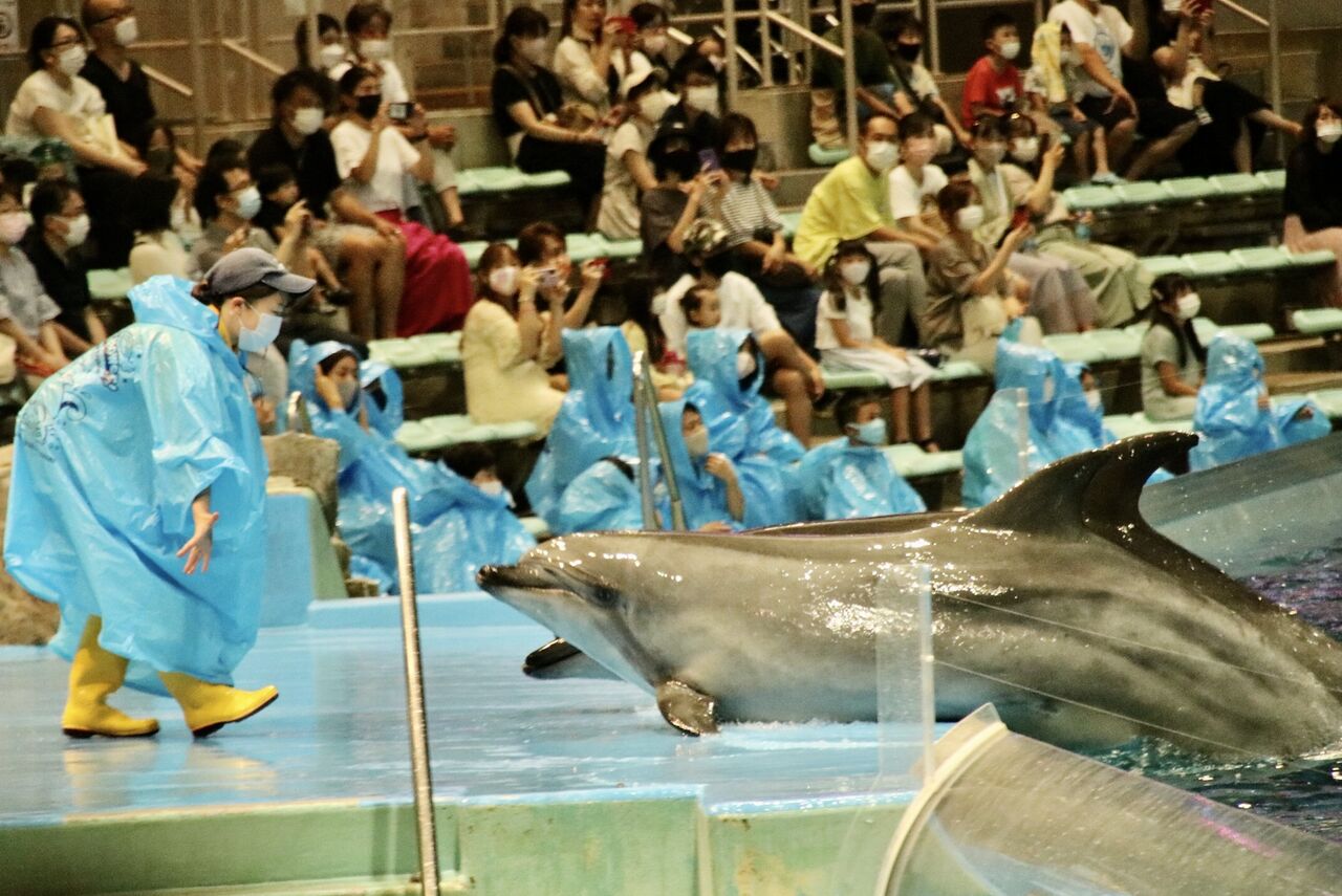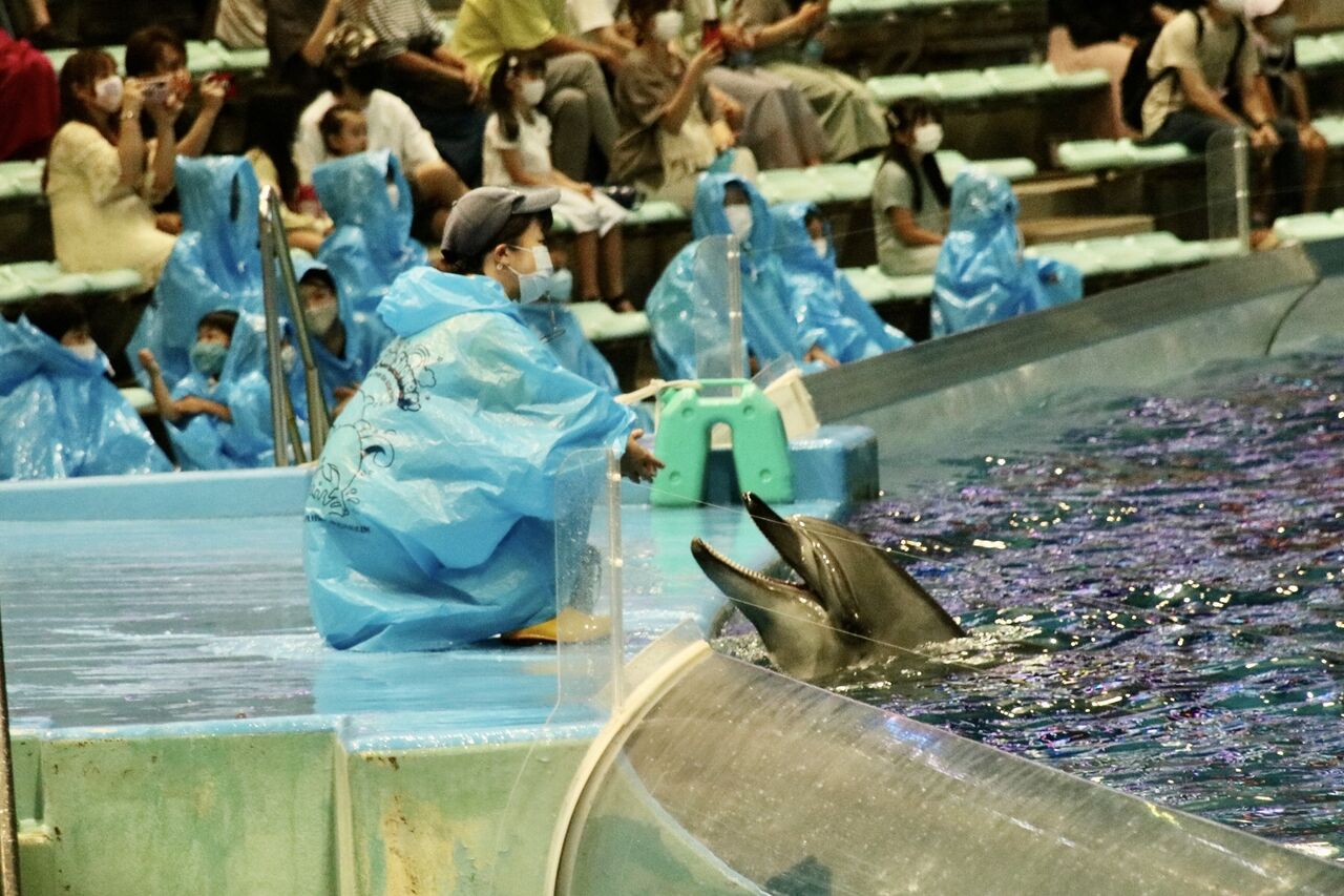 夏という事もあり、イルカたちが客席に向かって豪快に水をかける演出が非常に多く使われ、水をかけられた人たちは大はしゃぎ!その一方、今年はトレーナーとイルカたちが一緒に泳ぐような演出はありませんでした。水中ではトレーナーがマスクができないから(コロナ対策)でしょうか。