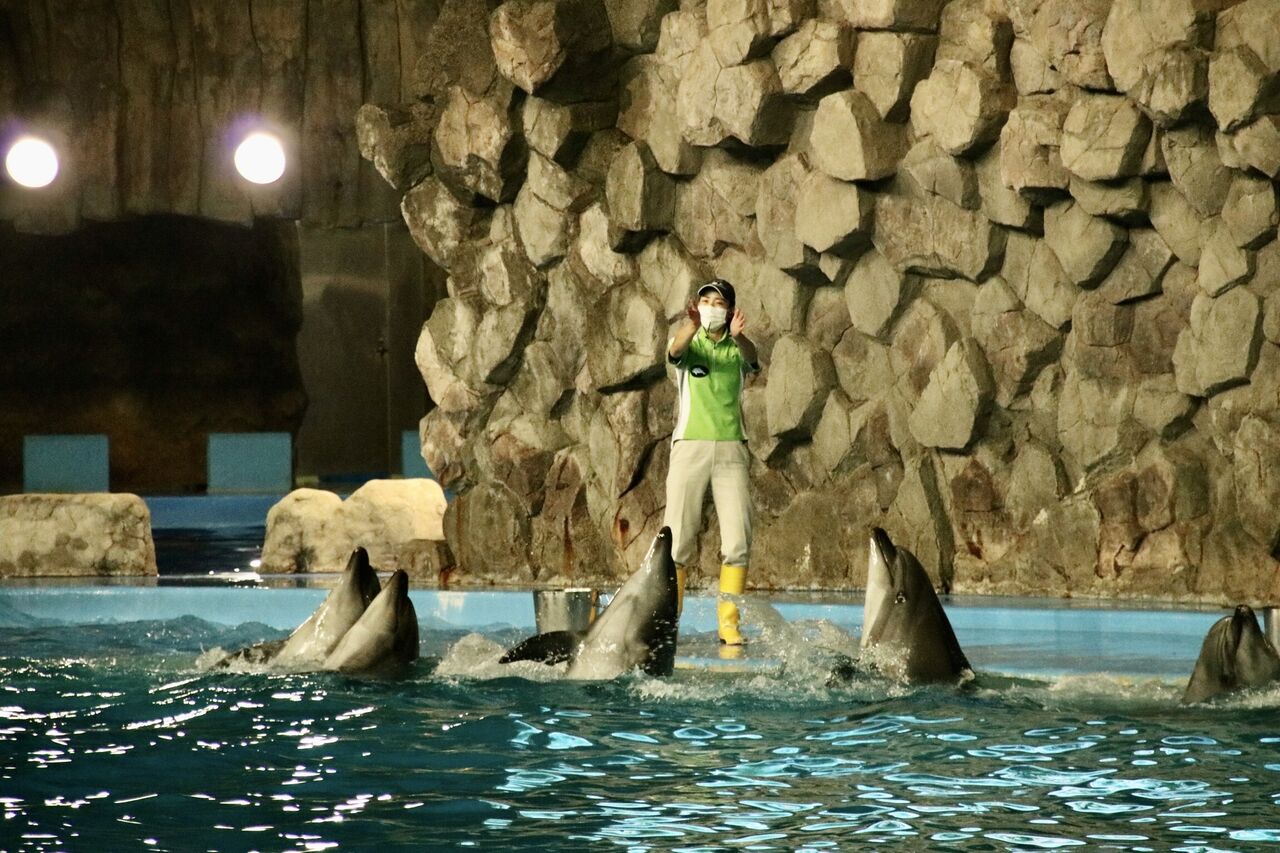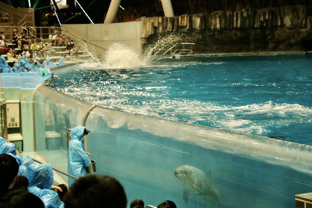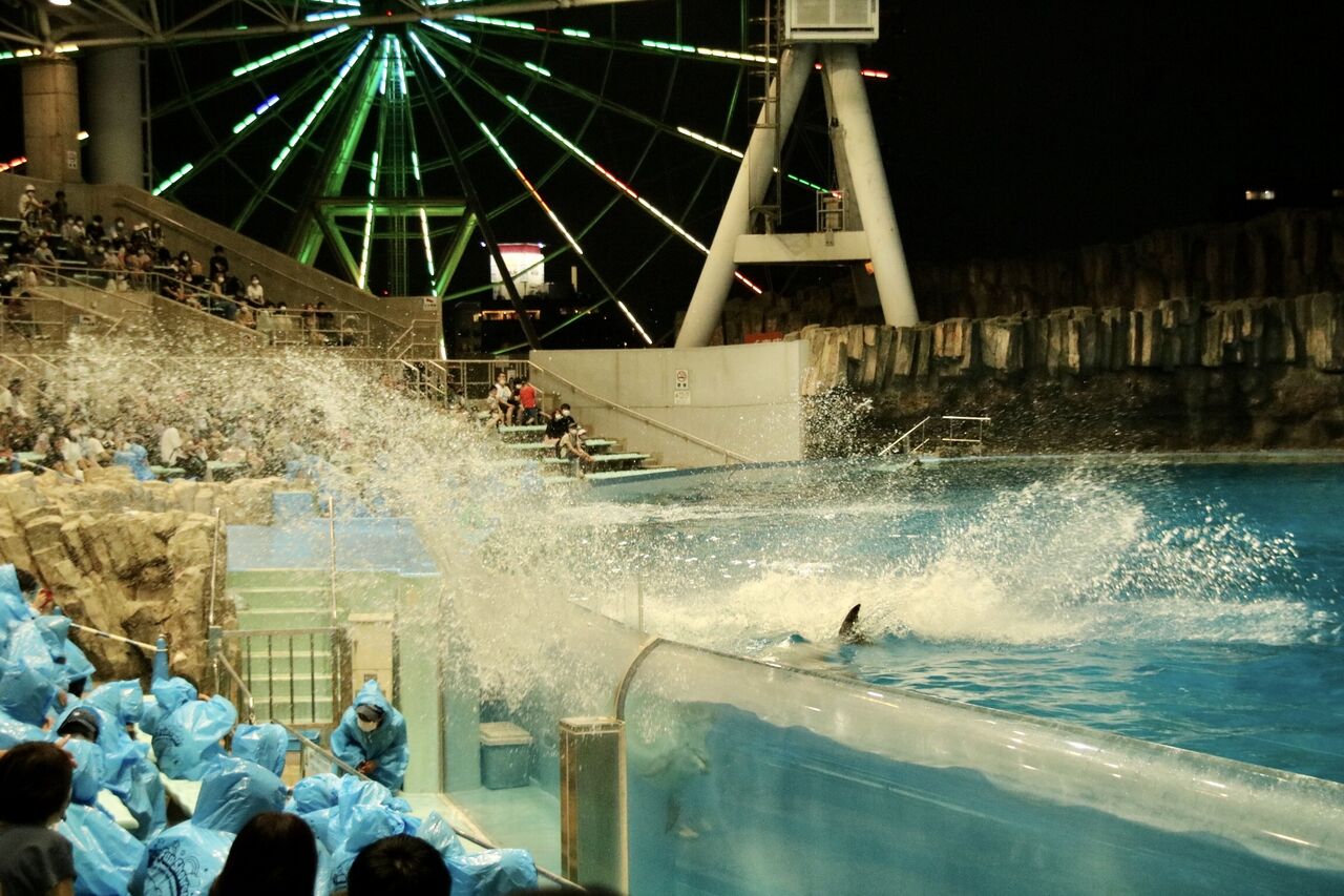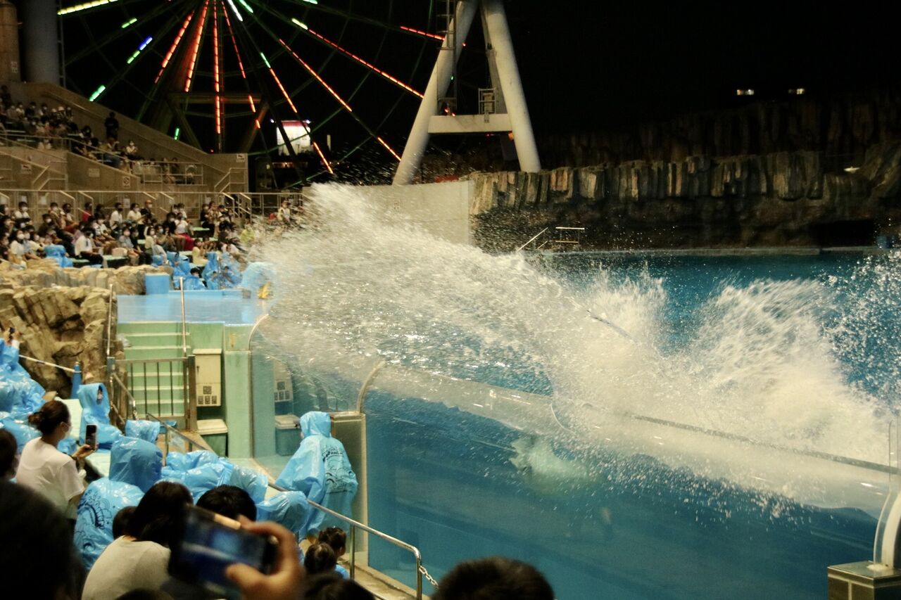 夏という事もあり、イルカたちが客席に向かって豪快に水をかける演出が非常に多く使われ、水をかけられた人たちは大はしゃぎ!その一方、今年はトレーナーとイルカたちが一緒に泳ぐような演出はありませんでした。水中ではトレーナーがマスクができないから(コロナ対策)でしょうか。