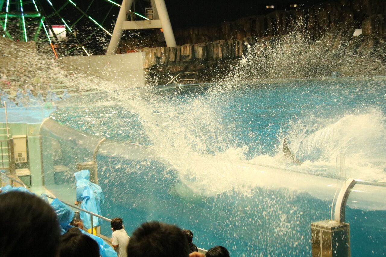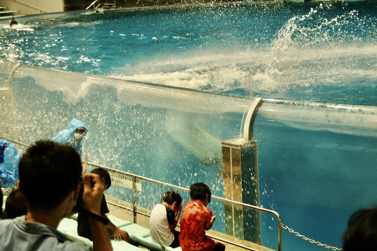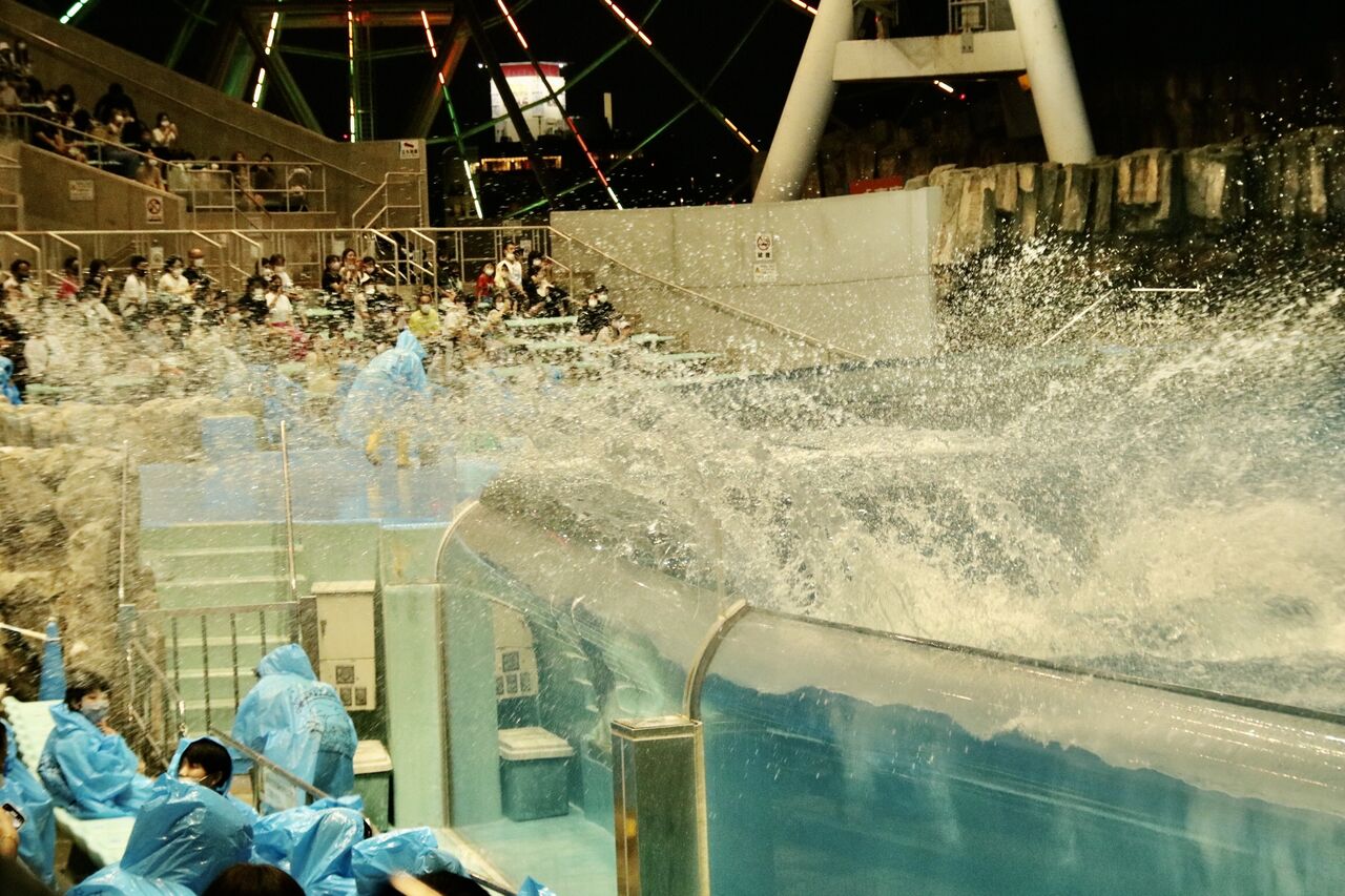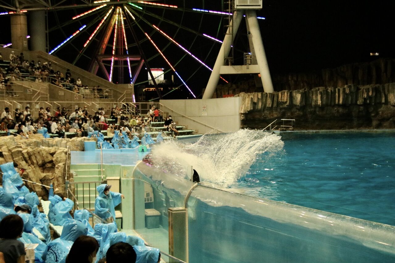 夏という事もあり、イルカたちが客席に向かって豪快に水をかける演出が非常に多く使われ、水をかけられた人たちは大はしゃぎ!その一方、今年はトレーナーとイルカたちが一緒に泳ぐような演出はありませんでした。水中ではトレーナーがマスクができないから(コロナ対策)でしょうか。