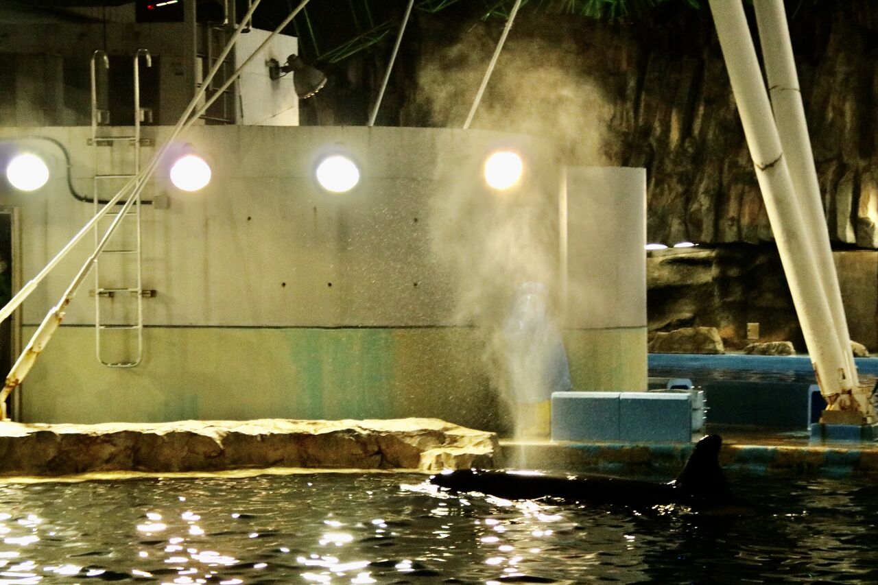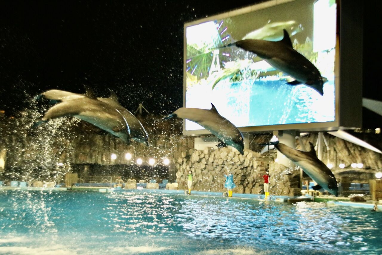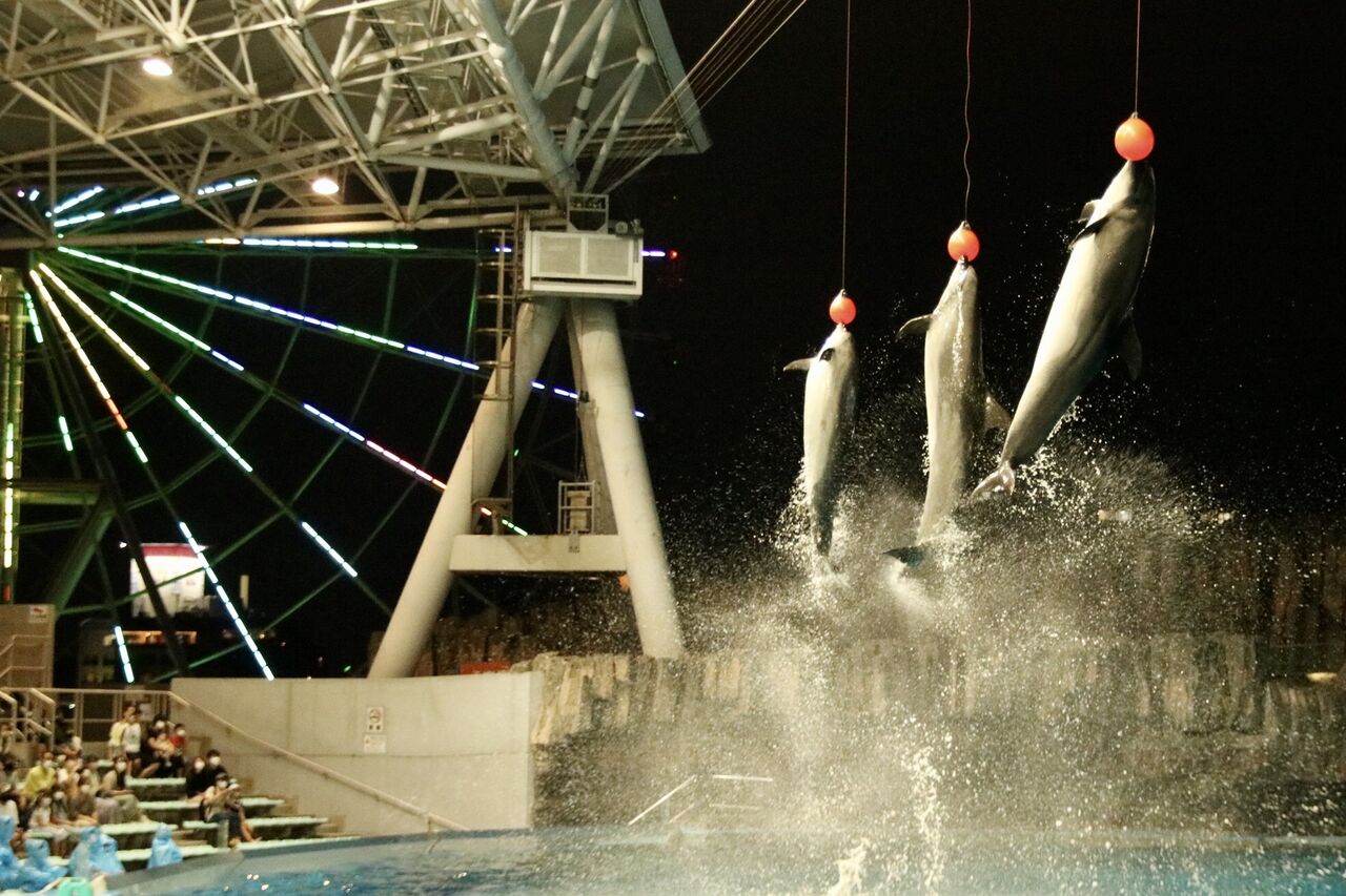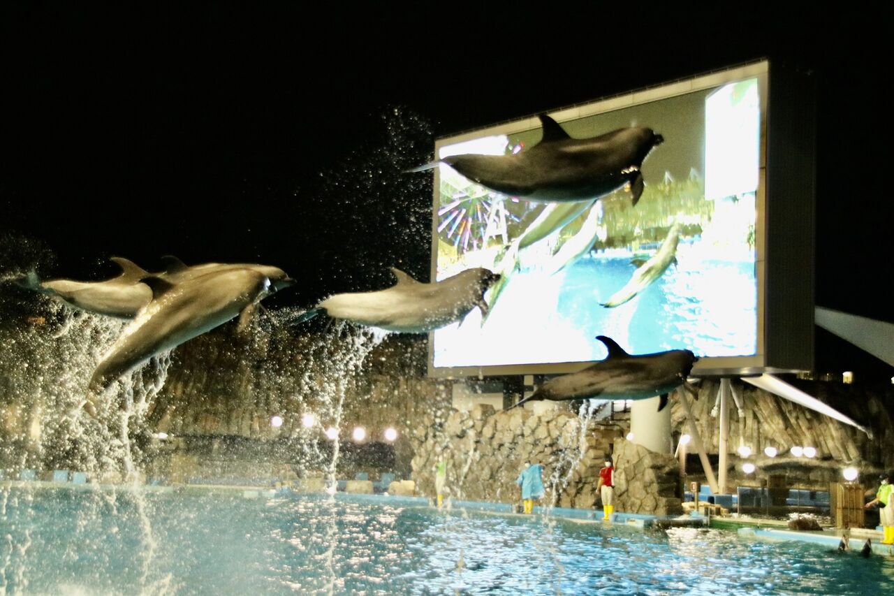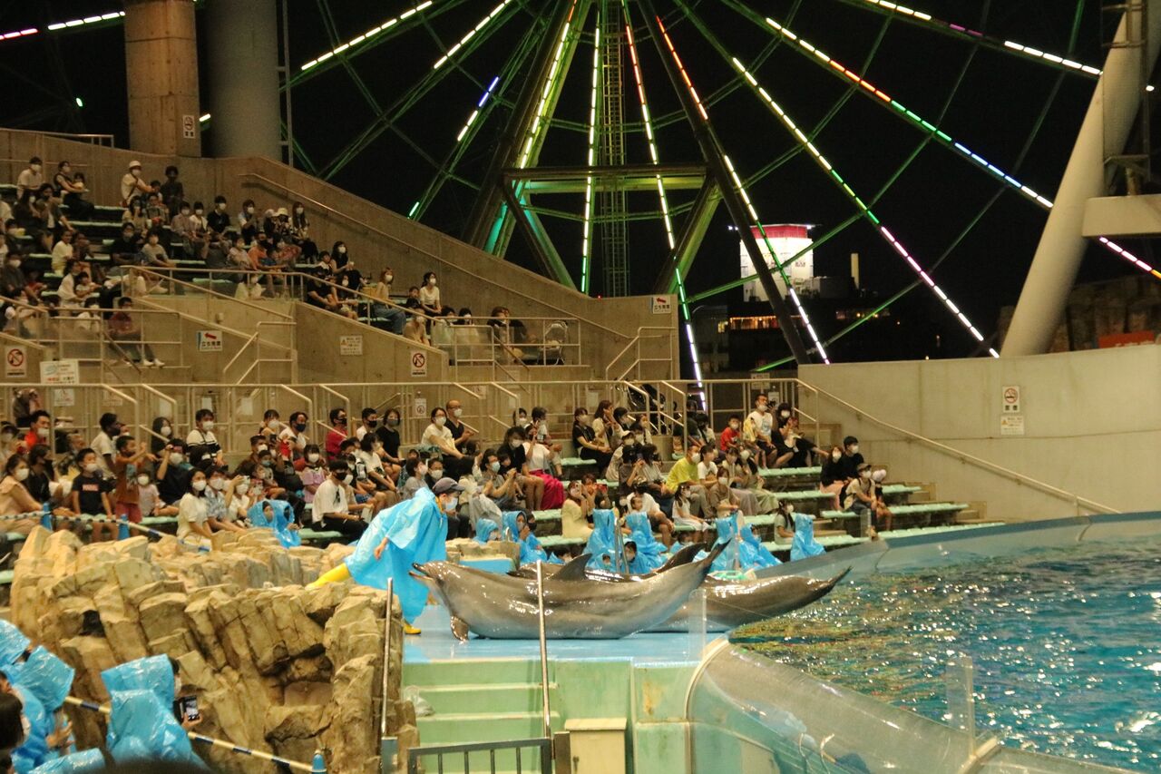 名古屋港水族館の営業時間は、夏休み中は閉館が20時まで延長され、日没後の19時からイルカショーが開催されます。