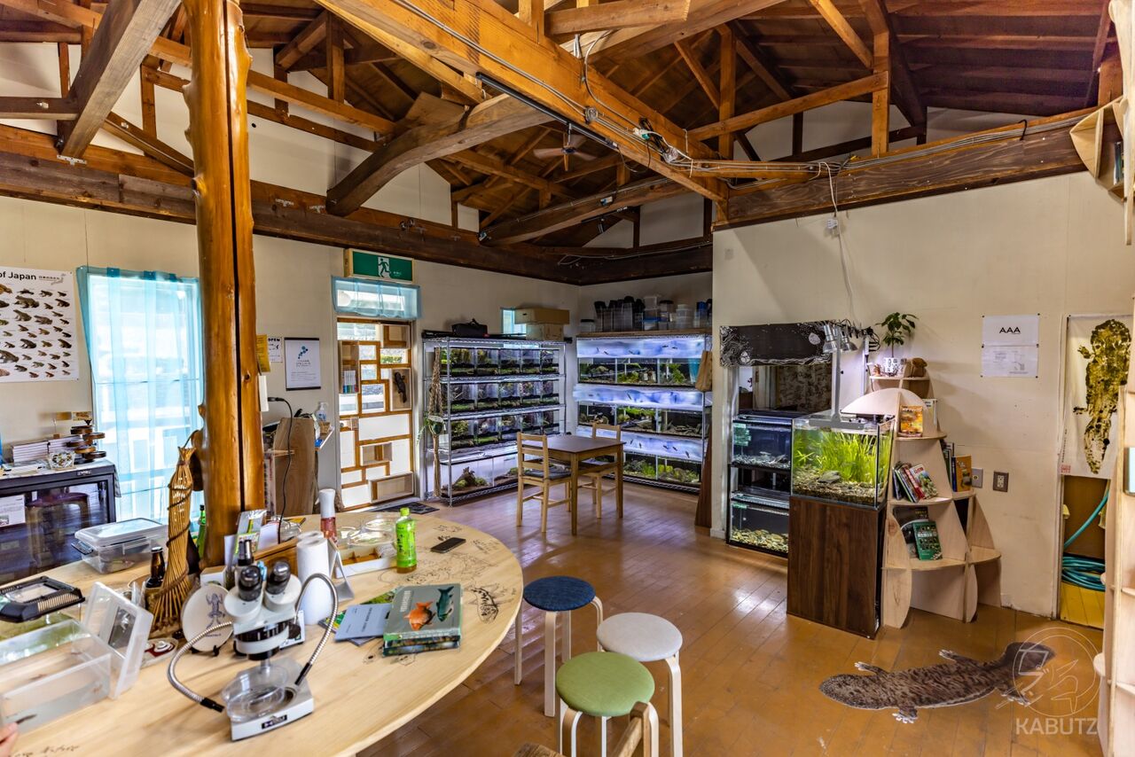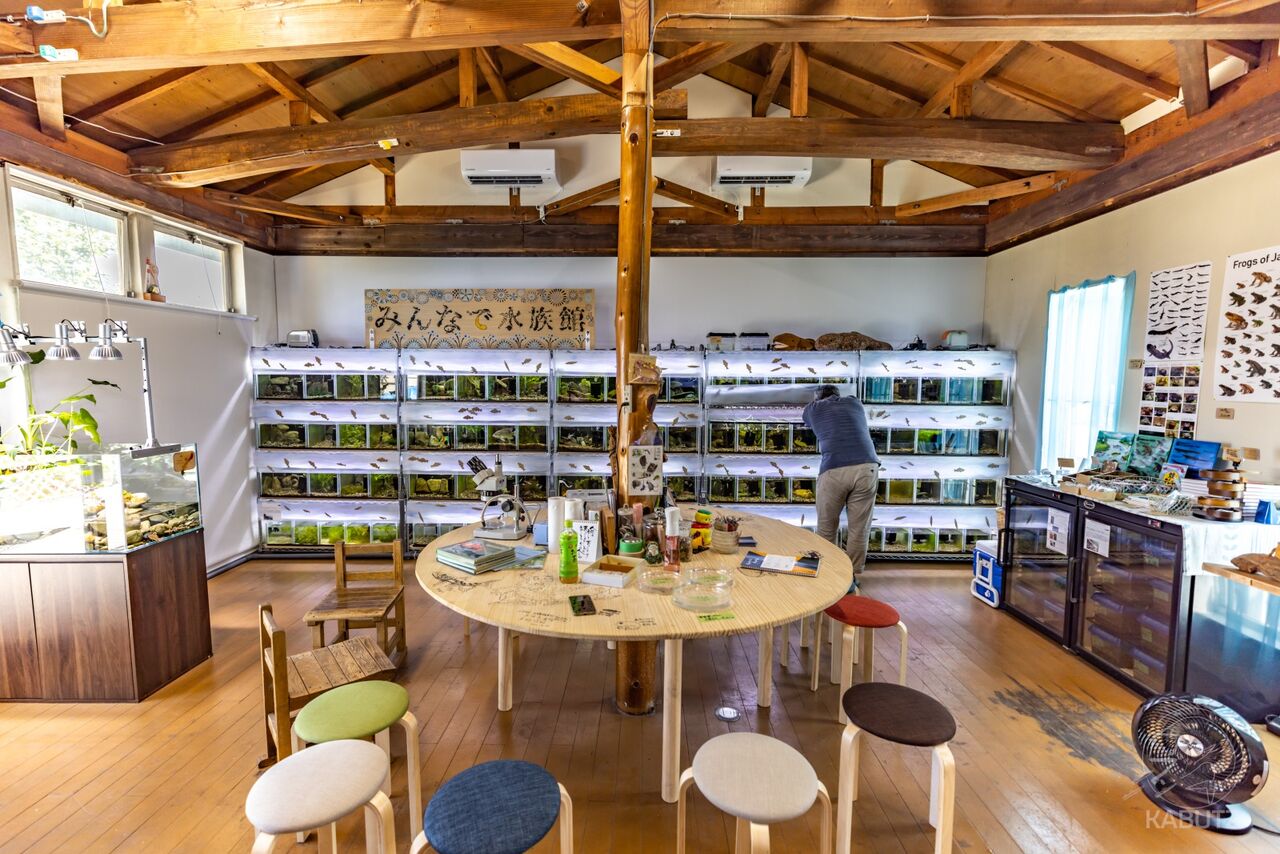 木造平屋の小さくて可愛い建物は元々カフェとして使われていた建物だそうです。この建物を水族館としてリニューアルし、2022年7月30日にオープンしました。工事などで生息場所を失った淡水生物を保護したり、繁殖させたりしてまた元の場所に戻す「生息域外保全センター」としての役割も担っています。